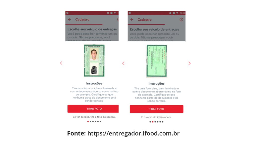Ao se cadastrar, o entregador precisa enviar o RG ou CNH, CPF e informações da conta bancária. Esses documentos servem para identificação e liberação do acesso à plataforma.